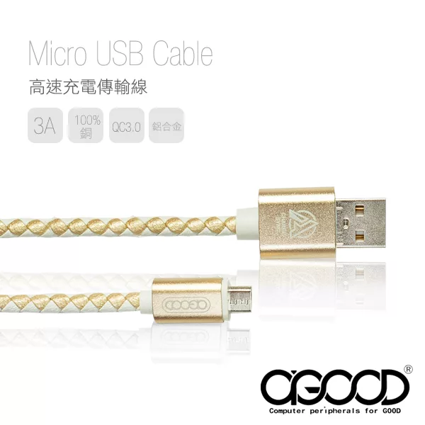 【A-GOOD】Micro USB皮革編織鋁合金快充傳輸充電線-30公分(金白-黑白)黑白![]()