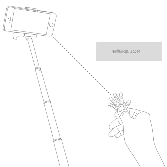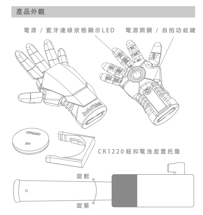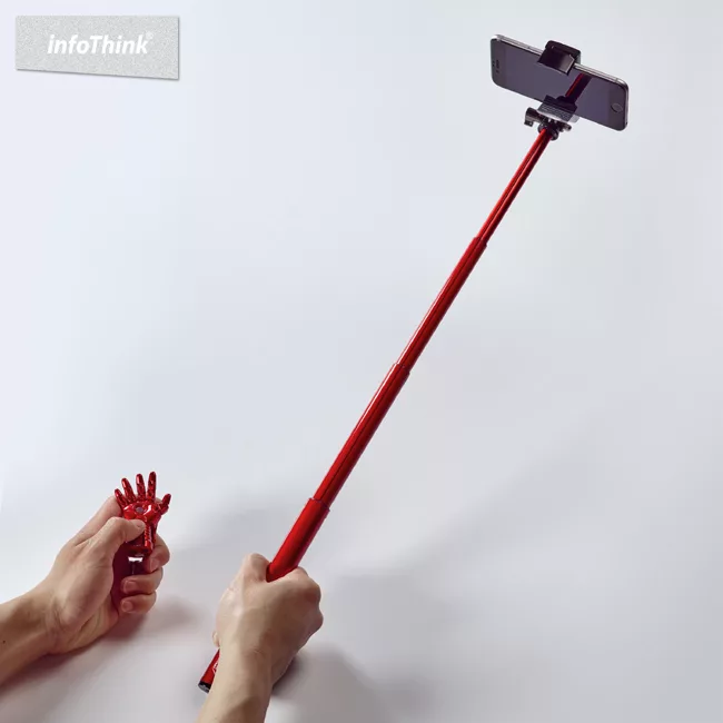 InfoThink訊想科技,採用鋼鐵人右手外觀設計之遙控自拍器,用來協助遠端控制具備藍芽4.0(簡稱BLE)之